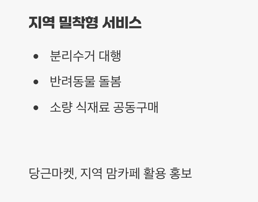 '바쁜 직장인을 위한 분리수거 대행', '여행 기간 동안의 반려동물 단기 돌봄 및 산책', '1인 가구를 위한 소량 식재료 공동구매 및 배달' 등이 좋은 예시입니다. 당근마켓이나 지역 맘카페 등 지역 커뮤니티를 통해 서비스를 홍보하고 초기 고객을 확보하는 것이 가장 현실적인 접근법입니다.