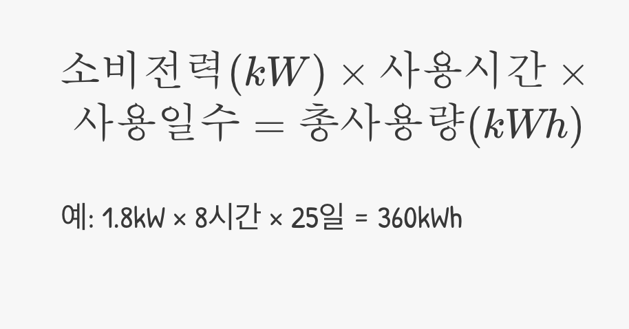 이제 하루에 에어컨을 몇 시간이나 사용하는지, 한 달 중 며칠이나 켤 것인지를 곱해주면 한 달 동안 에어컨이 사용할 총 전기량을 예측할 수 있습니다.