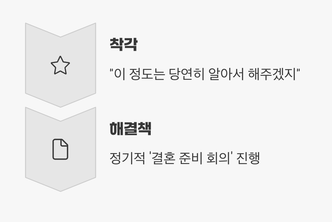 결혼 준비는 수백 가지의 크고 작은 결정으로 이루어진 거대한 프로젝트입니다. 이 과정에서 "이 정도는 당연히 알아서 해주겠지" 혹은 "말 안 해도 내 마음을 알 거야"라는 생각은 관계를 망치는 가장 위험한 착각입니다. 한 사람이 모든 것을 주도하거나, 반대로 서로에게 미루다 보면 오해와 서운함만 쌓이게 됩니다.