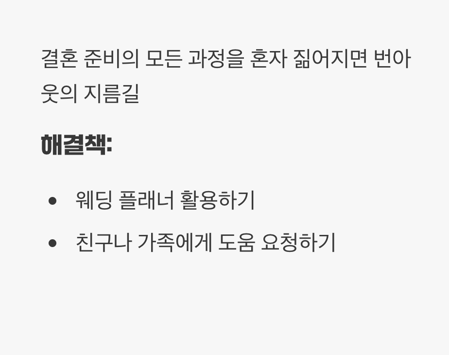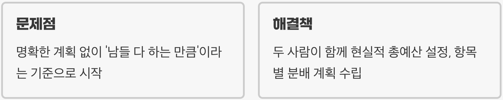 "친구는 OO 호텔에서 하던데…", "요즘은 이게 유행이라더라." SNS 속 화려한 결혼식 사진과 주변 사람들의 이야기에 휘둘리기 시작하면, 결혼의 주인공은 어느새 ‘우리’가 아닌 ‘남’이 되어버립니다. 남의 기준에 맞춰 불필요한 항목에 비용을 지출하고, 정작 우리가 원하는 것에는 집중하지 못하는 실수를 저지르게 됩니다.