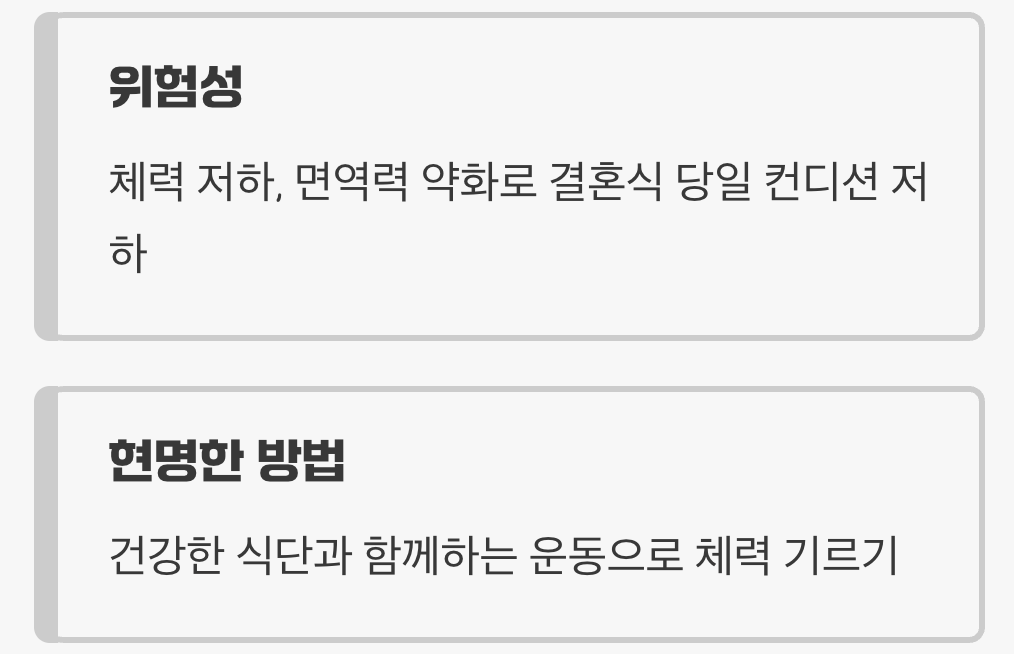 인생의 가장 아름다운 순간을 위해 완벽한 모습을 꿈꾸는 것은 당연합니다. 하지만 드레스 핏만을 위해 단기간에 무리한 다이어트를 감행하는 것은 몸과 마음을 모두 지치게 만드는 대표적인 실수입니다. 급격한 체중 감량은 체력 저하와 면역력 약화로 이어져, 정작 결혼식 당일 최상의 컨디션을 망칠 수 있습니다.