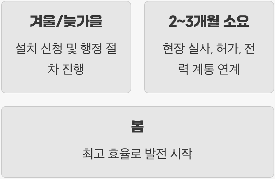 따라서 가장 확실한 해결책은, 발전량 피크 시즌인 봄에 맞춰 수익을 극대화할 수 있도록, 겨울이나 늦가을에 미리 설치를 준비하고 신청하는 것입니다. 겨울 동안 여유롭게 행정 절차를 마치고, 날이 풀리는 이른 봄부터 최고의 효율로 발전을 시작하는 것이 가장 현명한 전략입니다. 또한, 정부의 보조금 정책이 보통 연초에 발표되고 선착순으로 마감되는 경우가 많으므로, 연말부터 미리 준비하는 것이 보조금 혜택을 받기에도 유리합니다.