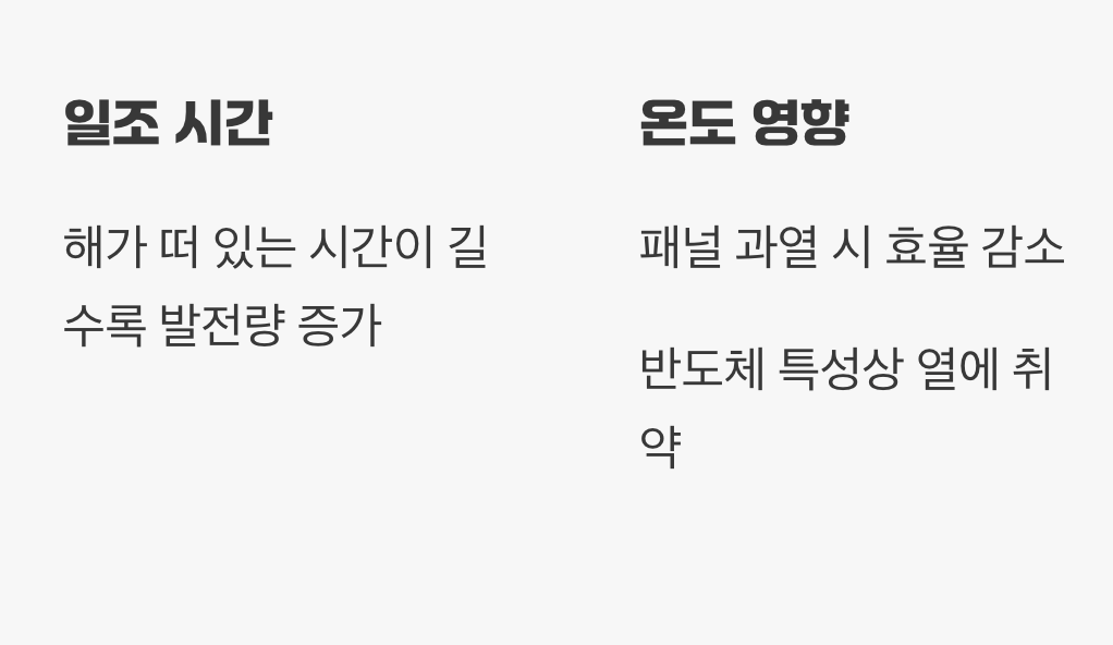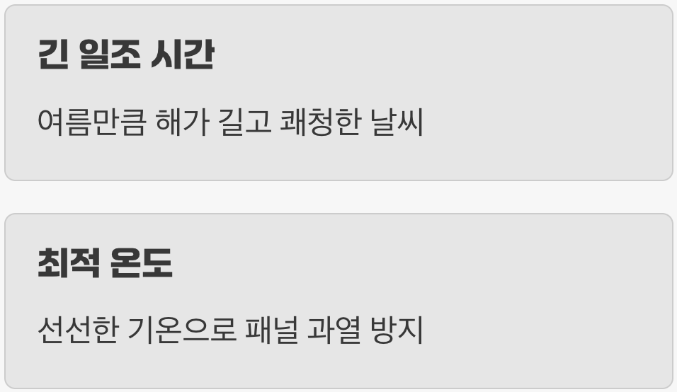 봄에 발전시간과 효율이 가장 높으며, 여름에는 온도 상승으로 효율이 떨어지고, 겨울은 발전시간이 가장 짧아 전체 출력이 낮습니다. - 태양광 발전의 효율, 그리고 온도와의 관계 - 재생에너지팔로워즈
