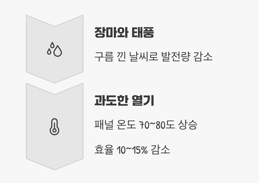 두 번째 복병은 앞서 말한 '온도'입니다. 한여름 뙤약볕 아래서 태양광 패널의 표면 온도는 70~80도까지 치솟을 수 있습니다. 이 과도한 열기는 패널의 효율을 10~15%까지 떨어뜨리는 원인이 됩니다. 따라서 여름철의 총 발전량은 봄보다 오히려 낮아지는 경우가 많습니다.
