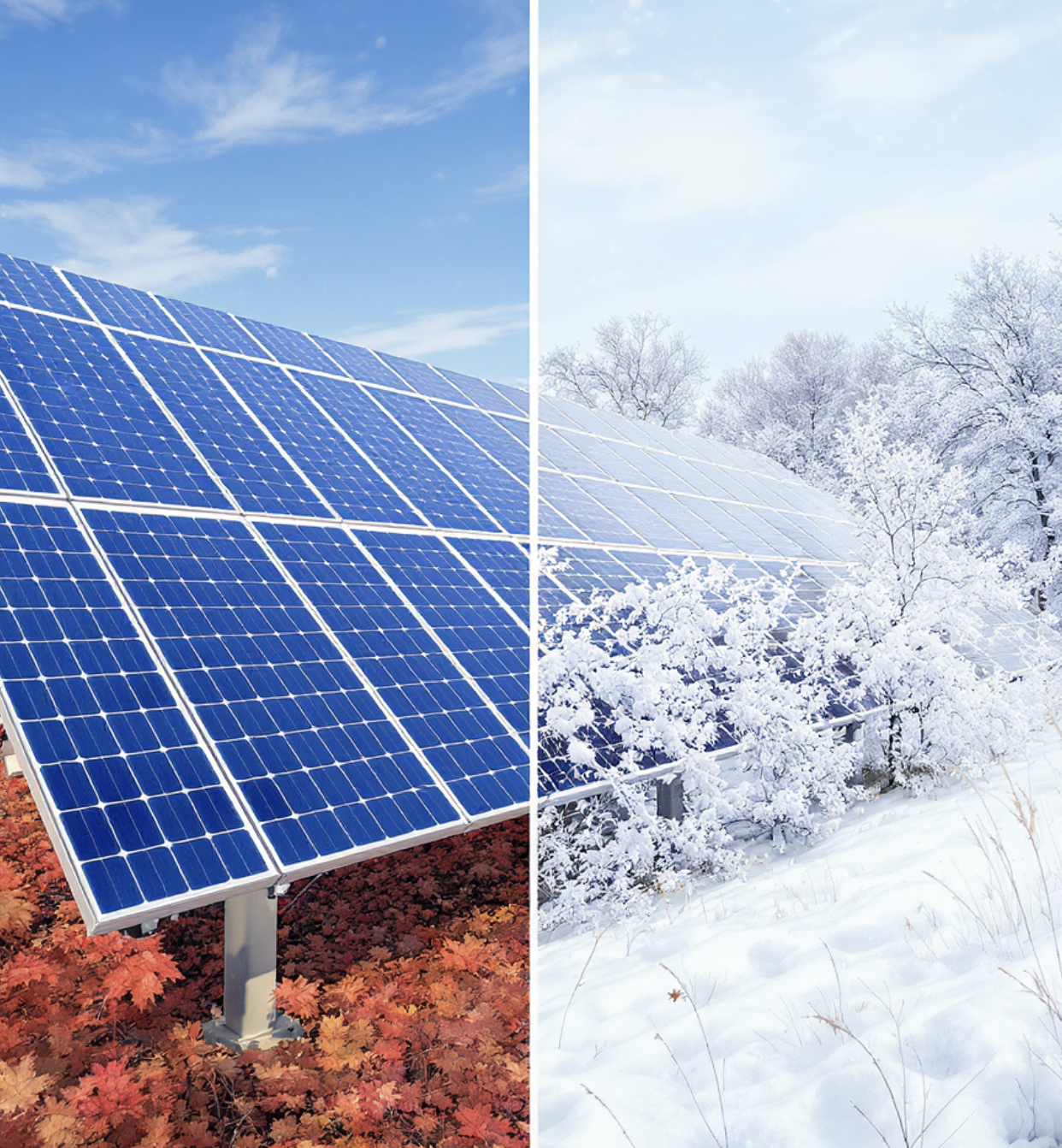 겨울(11~2월)은 해가 가장 짧고, 눈이 패널을 덮을 경우 발전이 중단될 수 있어 발전량이 가장 낮은 계절입니다. 하지만 의외의 장점도 있습니다. 기온이 낮아 패널의 효율은 오히려 높은 상태를 유지하며, 눈이 온 뒤 맑게 갠 날에는 눈이 반사판 역할을 하여 순간적인 발전량이 크게 증가하기도 합니다.
