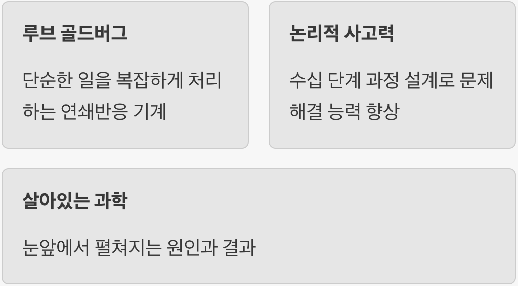 초등 과학 원리 중 에너지 전달 방법, 마찰, 힘의 분해 등도 골드버그 장치에서 체험적으로 이해할 수 있습니다.