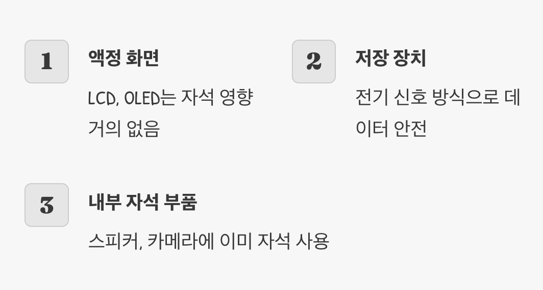 강한 자석은 스마트폰 나침반 기능 등 자기 센서에 영향을 주지만, 보통 센서 재설정으로 정상 작동하며 직접적 피해 우려는 낮습니다.