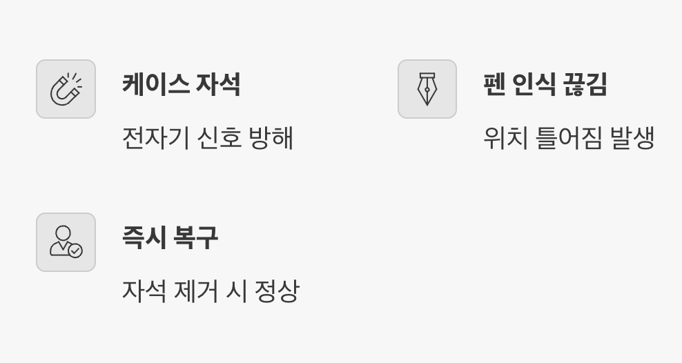 고장은 아니지만 글씨를 쓰거나 그림을 그릴 때 매우 불편합니다. 해결책은 자석이 없는 케이스를 쓰거나, 펜을 쓸 때만이라도 케이스를 벗기는 것입니다. 자석이 멀어지면 펜 기능은 즉시 정상으로 돌아옵니다. 기기 자체가 망가진 게 아니니 안심하고 사용 환경만 바꿔주시면 됩니다.