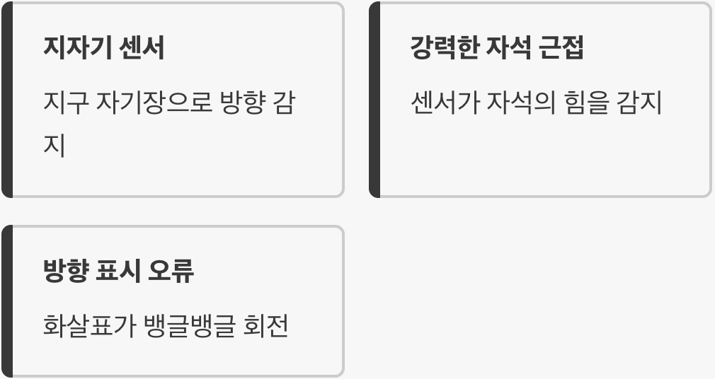 그런데 바로 옆에 강력한 네오디움 자석이 떡하니 붙어있다면? 센서는 지구의 자기장 대신 자석의 힘을 감지해 버립니다. 그래서 지도상의 내 위치 화살표가 뱅글뱅글 돌거나 엉뚱한 방향을 가리키게 되죠. 만약 길 찾기를 해야 한다면 잠시 자석 케이스나 거치대에서 폰을 떼어내는 것이 가장 빠르고 정확한 해결 방법입니다.