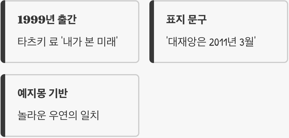 1999년 출간된 일본 만화 ‘내가 본 미래’에 2011년 3월 동일본 대지진이 정확히 예측되어 화제가 되었습니다. - "7월 5일, 일본에 대재앙 온다"...동일본 대지진 적중한 만화가의 예언 - YTN