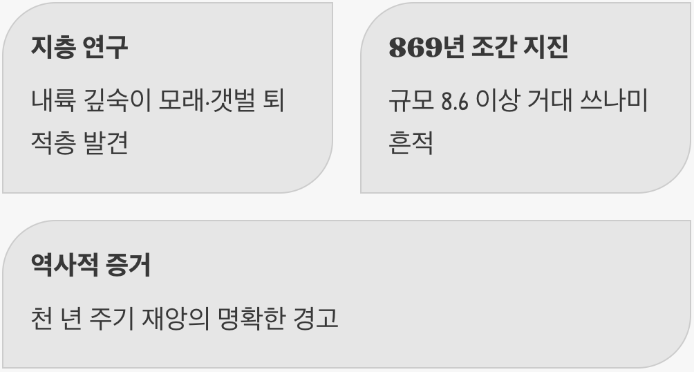 추가적인 연구 결과, 이 거대한 쓰나미의 흔적은 서기 869년에 발생했던 ‘조간 지진(貞観地震)’의 것임이 밝혀졌습니다. 즉, 과학자들은 이미 천 년 전에도 2011년과 거의 똑같은 규모의 재앙이 바로 그 자리에서 일어났었다는 역사적 사실을 알고 있었습니다. 이 과거의 기록이야말로 미래를 향한 가장 강력하고도 명확한 경고였습니다.