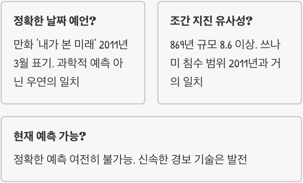 A. ‘내가 본 미래’라는 만화책 표지에 ‘2011년 3월’이라고 적힌 사례가 있지만, 이는 과학적 근거가 있는 예측이라기보다는 놀라운 우연으로 보는 것이 일반적입니다. 날짜와 시간까지 정확히 예측한 과학적, 초자연적 예언은 공식적으로 존재하지 않았습니다.