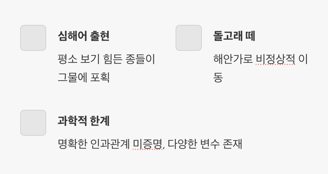 거대한 자연재해가 발생하기 전, 동물들이 이상 행동을 보인다는 이야기는 오래전부터 전해져 내려왔습니다. 동일본 대지진 당시에도 비슷한 증언들이 있었습니다. 지진 발생 며칠 전부터 평소에는 보기 힘든 심해어들이 그물에 잡히거나, 해안가로 돌고래 떼가 밀려오는 등의 현상이 관찰되었다는 것입니다.
