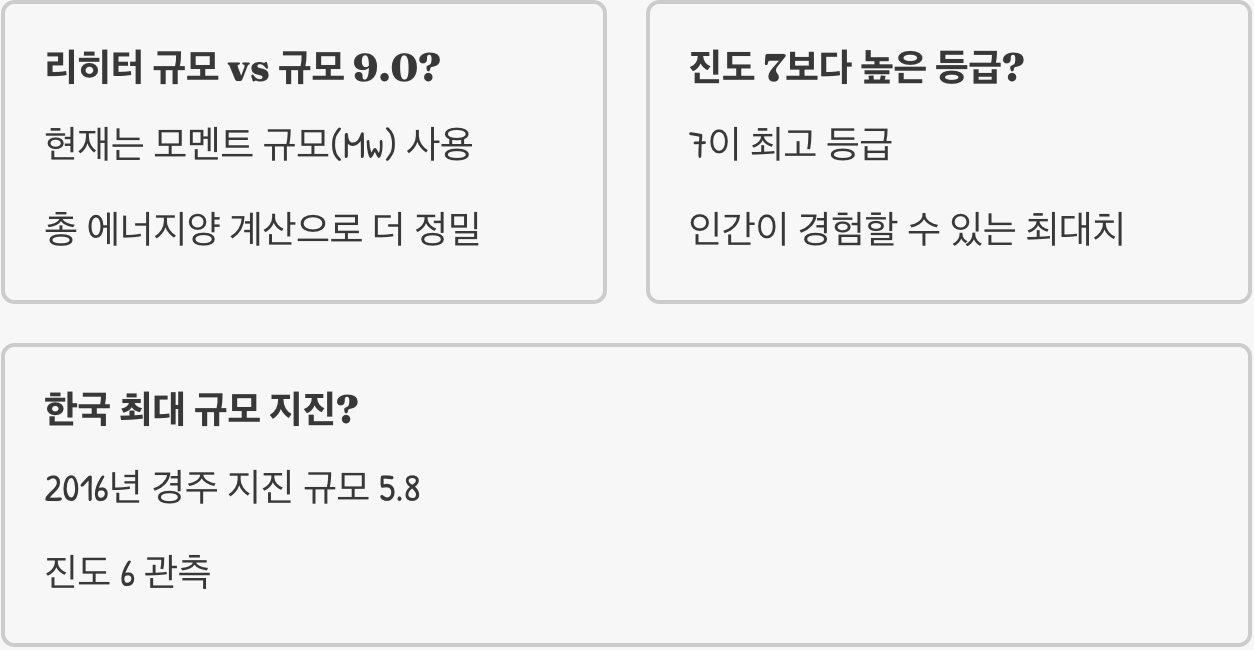 A. 조금 다릅니다. 초기에 사용되던 ‘리히터 규모’는 특정 지진계로 측정한 값이라 큰 규모의 지진에서는 정확도가 떨어지는 한계가 있었습니다. 현재는 지진이 방출한 총 에너지양을 계산하는 더 정밀한 ‘모멘트 규모(Mw)’를 사용하며, 동일본 대지진의 ‘규모 9.0’은 바로 이 모멘트 규모를 의미합니다.