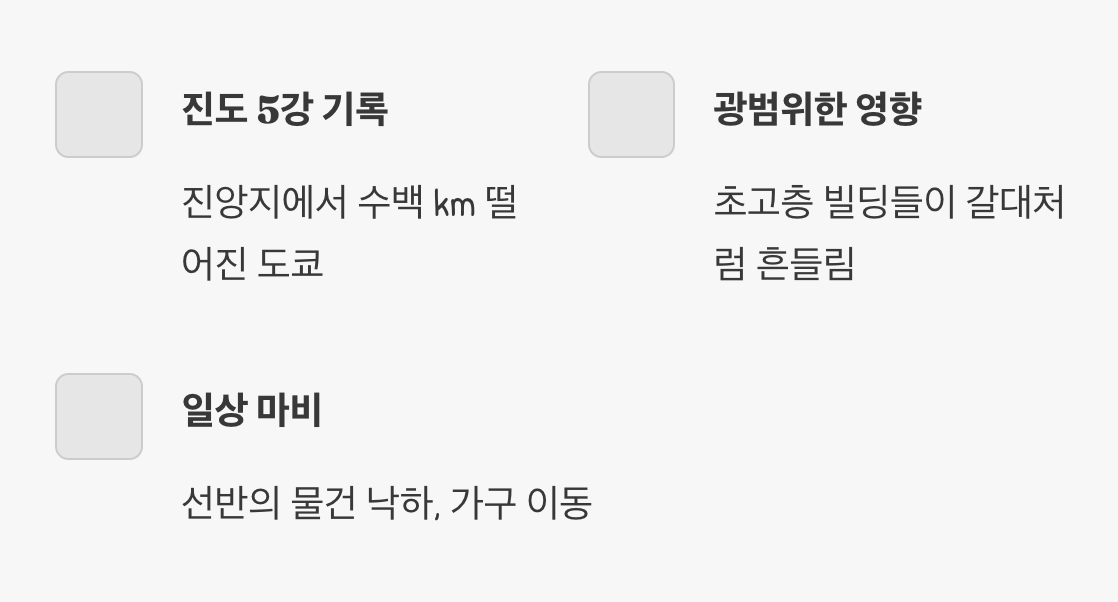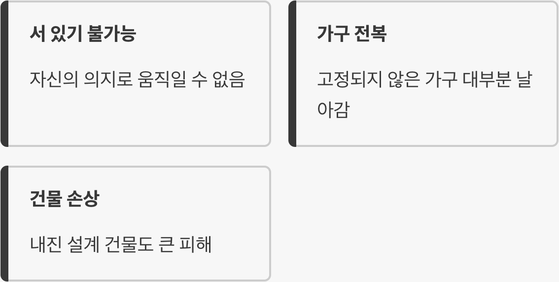 ‘진도 7’은 우리가 상상하는 ‘흔들림’의 수준을 아득히 뛰어넘습니다. 사람은 자신의 의지대로 서 있거나 움직이는 것이 불가능하며, 고정되지 않은 가구 대부분이 날아가듯 쓰러지고, 내진 설계가 잘 된 건물조차 큰 손상을 입을 수 있는 격렬한 충격입니다. 바로 그곳에 있던 사람들은 말 그대로 하늘과 땅이 뒤집히는 듯한 공포를 겪어야 했습니다.