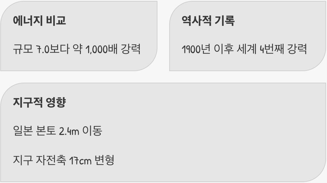 이 어마어마한 에너지는 일본 관측 역사상 최대였을 뿐만 아니라, 1900년 이후 전 세계에서 발생한 지진 중 네 번째로 강력한 기록이었습니다. 이 충격으로 일본의 본토가 동쪽으로 2.4m나 이동했고, 심지어 지구의 자전축마저 약 17cm 변형시켰을 정도니, 그 파괴력이 지구 전체에 미쳤다고 해도 과언이 아닙니다.