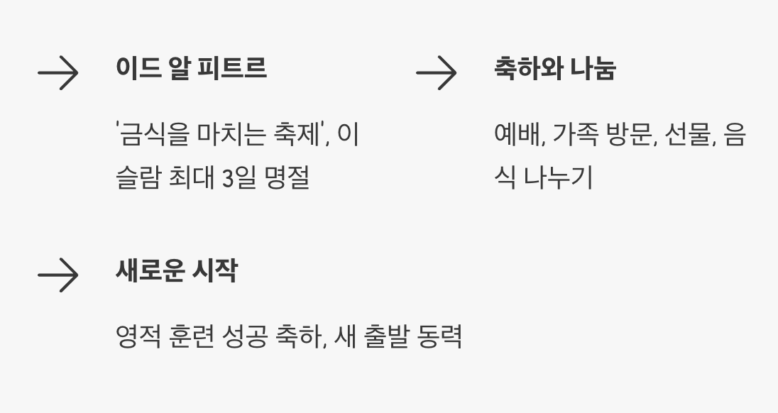 이는 단순히 금식이 끝나서 기뻐하는 축제가 아닙니다. 한 달 동안의 영적인 훈련을 성공적으로 마친 것을 서로 축하하고, 그 과정에서 얻은 깨달음과 감사의 마음을 새로운 시작의 동력으로 삼는, 아주 중요하고도 기쁨이 가득한 재탄생의 시간입니다.