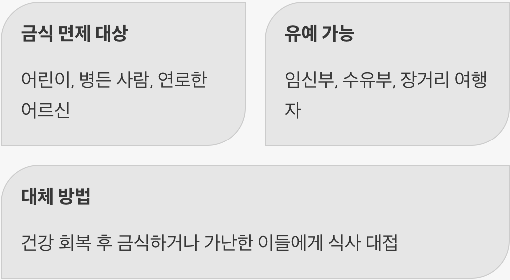 이슬람의 다섯 가지 의무 중 하나일 만큼 중요한 금식이지만, 모두에게 무조건적으로 강요되는 것은 아닙니다. 이슬람 율법은 신체적으로 금식이 어려운 사람들을 위한 예외를 두고 있습니다. 아직 성인이 되지 않은 어린이나, 병든 사람, 연로한 어르신은 금식 의무에서 제외됩니다.