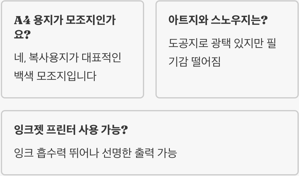 A. 물론입니다. 모조지는 잉크 흡수력이 매우 뛰어나서 잉크젯 프린터와 레이저 프린터 모두에서 아주 깨끗하게 출력됩니다. 번짐 현상 없이 선명한 문서 출력을 원한다면 가장 적합한 용지입니다.