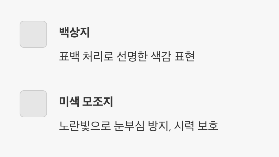 하지만 글자가 빽빽한 책을 읽을 때는 약간 노란빛이 도는 '미색 모조지'를 선택하는 것이 좋습니다. 너무 하얀색은 빛을 강하게 반사해 눈부심을 유발할 수 있기 때문입니다. 소설책이나 교과서가 대부분 누런색 종이를 쓰는 이유도 독자의 눈을 보호하기 위해서입니다. 시력 보호가 최우선이라면 망설이지 말고 따뜻한 느낌의 미색을 고르세요.
