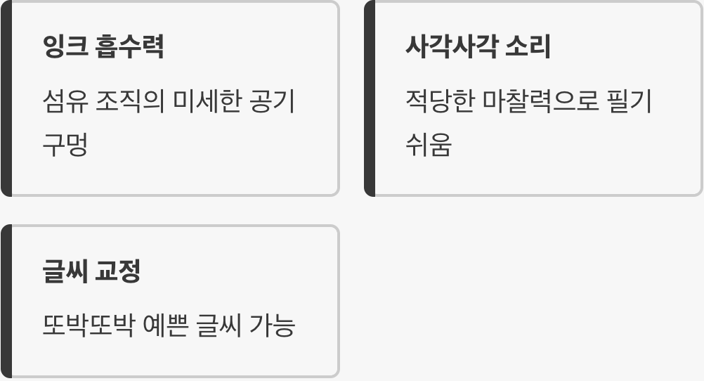 연필로 쓸 때 들리는 '사각사각'하는 기분 좋은 소리는 바로 이 종이 표면의 마찰력 때문입니다. 펜을 잡은 손에 적당한 저항감을 주어 글씨를 또박또박 예쁘게 쓸 수 있도록 도와줍니다. 악필을 교정하고 싶거나 필기 양이 많은 학생이라면, 미끄러운 종이 대신 잉크 흡수력이 뛰어난 이 종이를 사용하는 것이 글씨 실력을 늘리는 최고의 해결책입니다.