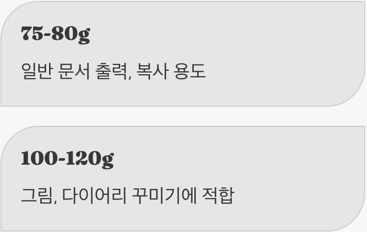 만약 그림을 그리거나 다이어리를 꾸밀 예정이라면 100g이나 120g 이상의 도톰한 두께를 추천합니다. 종이가 너무 얇으면 뒷면에 글씨가 비치거나 지우개질을 할 때 구겨질 수 있기 때문입니다. 용도에 맞게 적절한 두께를 선택하는 것만으로도 작업의 완성도를 훨씬 높일 수 있습니다.