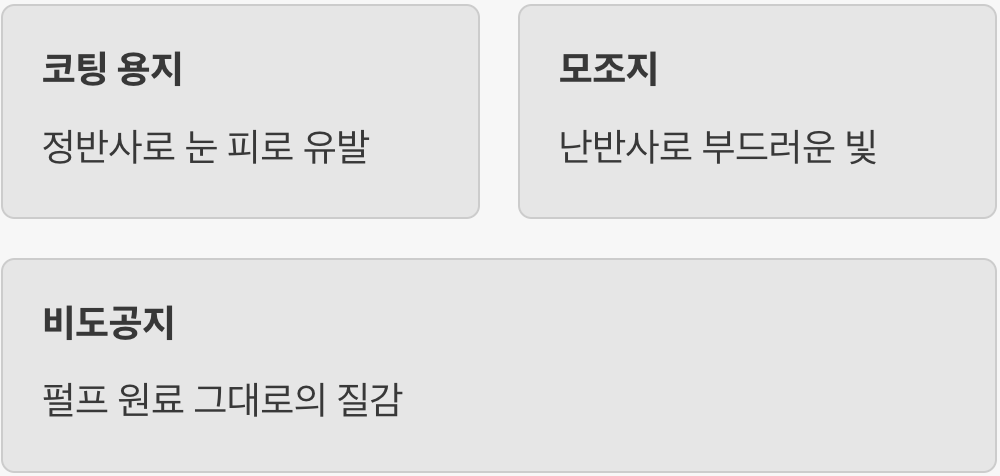 우리가 사물을 볼 수 있는 것은 빛이 물체에 반사되어 눈으로 들어오기 때문입니다. 그런데 아트지나 스노우지처럼 표면이 매끄럽고 반짝이는 코팅 용지는 빛을 거울처럼 정반사 시킵니다. 강한 빛이 그대로 눈을 찌르기 때문에 눈 근육이 긴장하고 쉽게 지치게 되는 것입니다. 오랫동안 공부해야 하는 수험생들이 코팅된 교재를 피해야 하는 이유가 바로 여기에 있습니다.