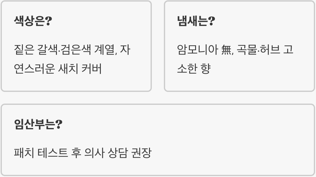 A. 네, 암모니아가 들어있지 않아서 코를 찌르는 독한 냄새가 거의 없습니다. 대신 곡물이나 허브 가루 특유의 고소하거나 풀 냄새가 날 수 있습니다. 환기가 잘 안 되는 욕실에서도 편안하게 염색할 수 있다는 것이 가장 큰 장점 중 하나입니다.