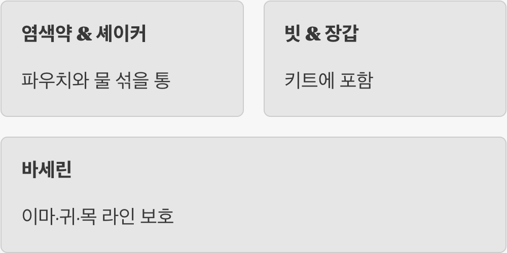 가장 먼저 필요한 것은 물염색약 파우치와 물을 섞을 통(셰이커), 그리고 빗과 장갑입니다. 보통 제품을 사면 키트 안에 다 들어있으니 따로 준비할 것은 미지근한 물뿐입니다. 시작하기 전에 이마와 귀 뒤쪽, 목 라인에 바세린이나 크림을 듬뿍 발라주세요. 혹시라도 염색약이 피부에 묻었을 때 착색되지 않고 쉽게 지워지게 해주는 필수 방어막입니다.