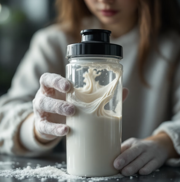 이제 셰이커 통에 물을 먼저 넣고 그 위에 가루를 넣어줍니다. 순서를 반대로 하면 가루가 바닥에 눌어붙어 잘 안 섞일 수 있습니다. 물의 온도는 너무 차갑지도 뜨겁지도 않은 미지근한 물이 가장 좋습니다. 비율은 제품마다 조금씩 다르지만 보통 가루 1포에 물 50ml 정도입니다. 설명서를 꼭 확인하고 정확한 양을 넣어주세요.