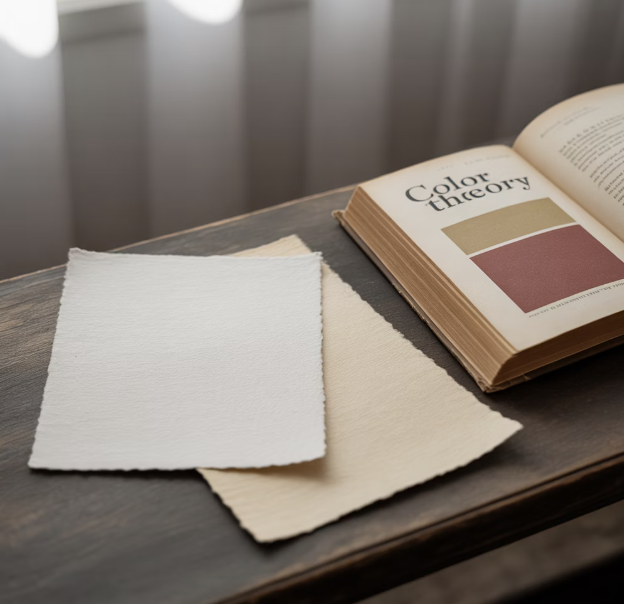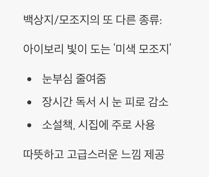 백상지/모조지는 우리가 아는 새하얀 색상 외에, 약간의 아이보리 빛이 도는 '미색 모조지'도 있습니다. 이는 눈부심을 줄여주어 장시간 글을 읽을 때 눈의 피로를 덜어주는 아주 고마운 종이입니다.