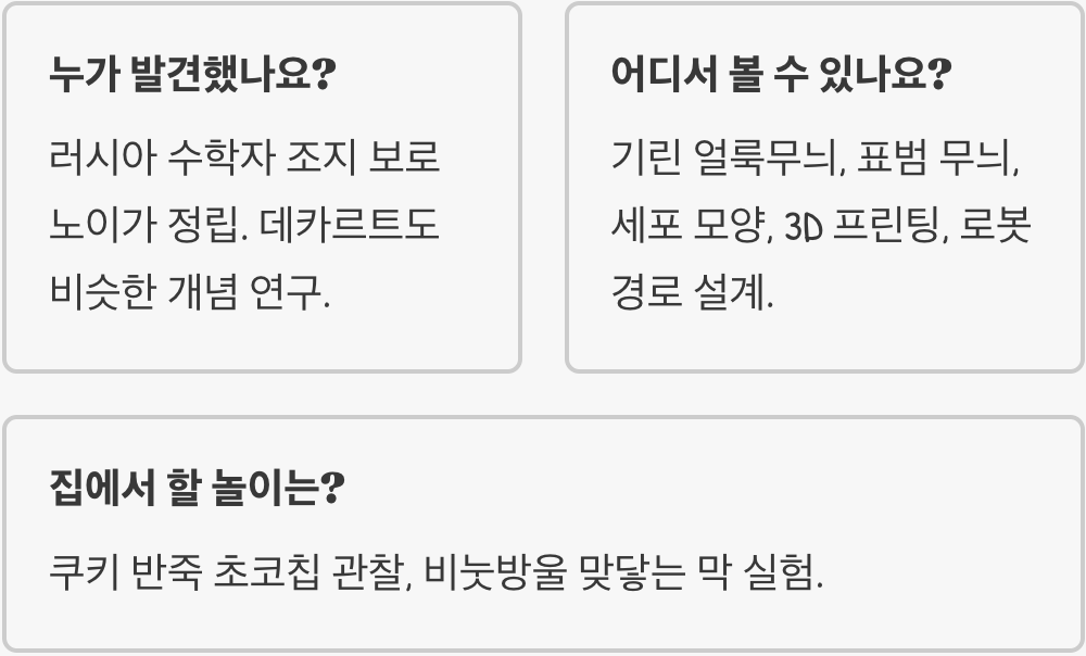 아이들에게 이 개념을 설명할 때는 밖으로 나가 자연 관찰을 하는 것이 최고의 해결책입니다. 나뭇잎의 잎맥이나 옥수수 알갱이의 배열을 보며 "이 구역의 주인은 누구일까?"라고 질문을 던져보세요. 자연스럽게 자기 영역을 지키려는 힘들이 만나 균형을 이룬 모습이라는 것을 깨닫게 해주면, 수학이 책 속에만 있는 지루한 학문이 아니라는 사실을 알게 됩니다.
