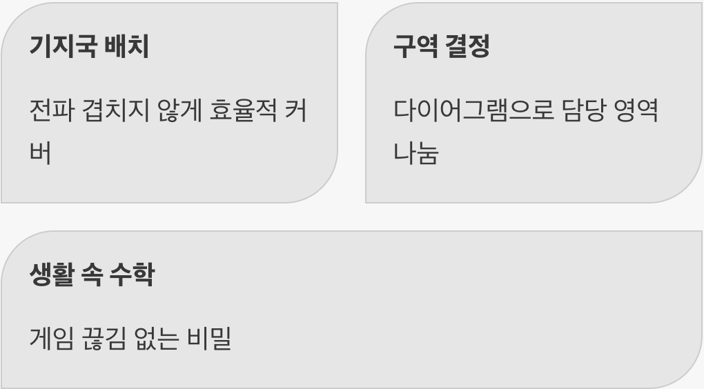우리가 매일 쓰는 스마트폰이나 내비게이션에도 이 원리가 숨어 있습니다. 이동통신사는 기지국을 어디에 세워야 전파가 겹치지 않고 효율적으로 도시 전체를 커버할 수 있을지 고민합니다. 이때 바로 이 다이어그램을 활용해 기지국 하나가 담당할 구역을 결정합니다.