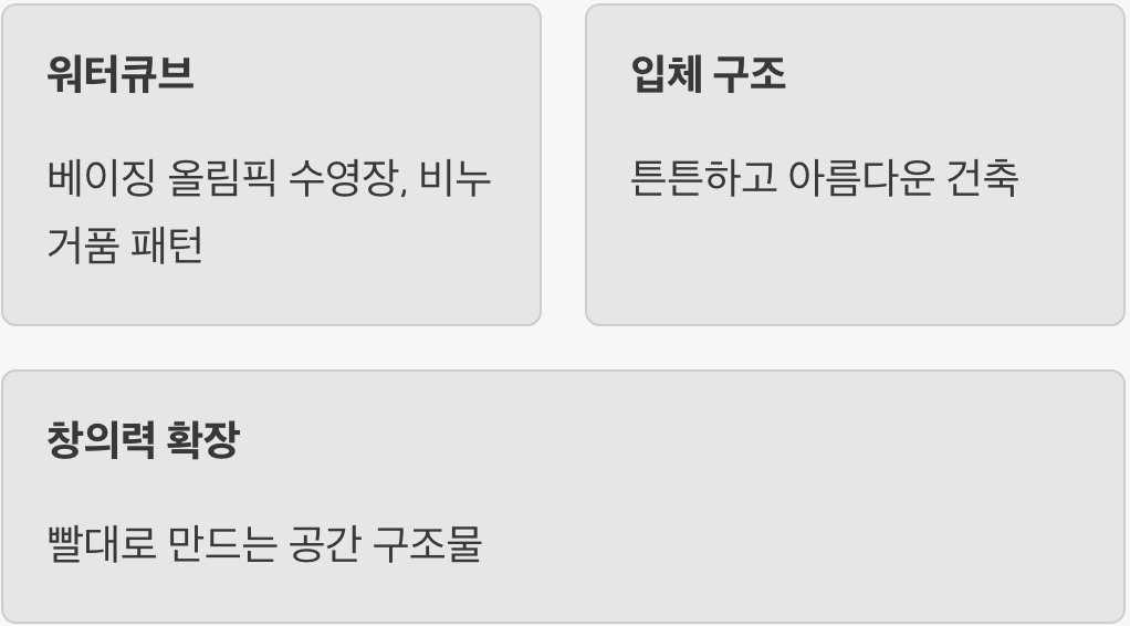 세계적인 건축물 중에는 이 패턴을 활용해 지은 것들이 많습니다. 베이징 올림픽 수영 경기장인 '워터큐브'가 대표적입니다. 비누 거품이 모여 있는 모양을 본떠 만든 이 건물은 튼튼하면서도 아름답습니다. 단순히 평면에 그리는 것을 넘어 입체적인 구조물로 상상력을 넓혀주는 것이 중요합니다.