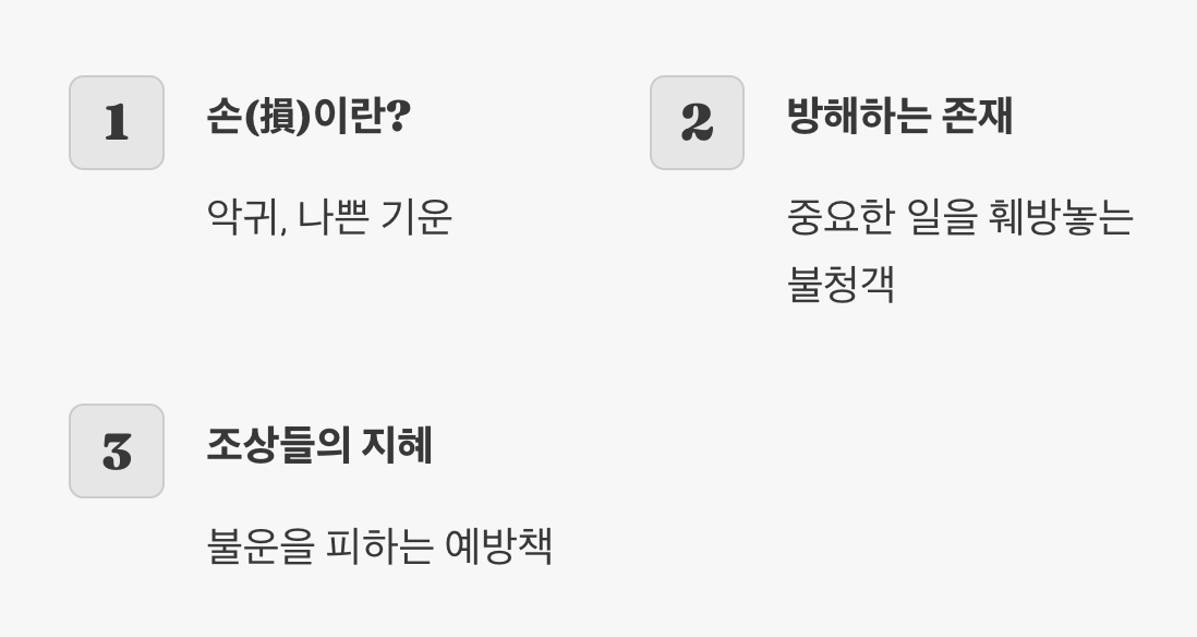 음력 날짜의 끝자리 숫자를 기준으로, 1일과 2일에는 동쪽, 3일과 4일에는 남쪽, 5일과 6일에는 서쪽, 7일과 8일에는 북쪽에서 이 ‘손’이 활동한다고 보았습니다. 그래서 만약 음력 1일에 동쪽으로 이사를 가면, 마침 그곳에서 활동 중인 악귀와 정면으로 마주치게 된다고 생각했던 것입니다.