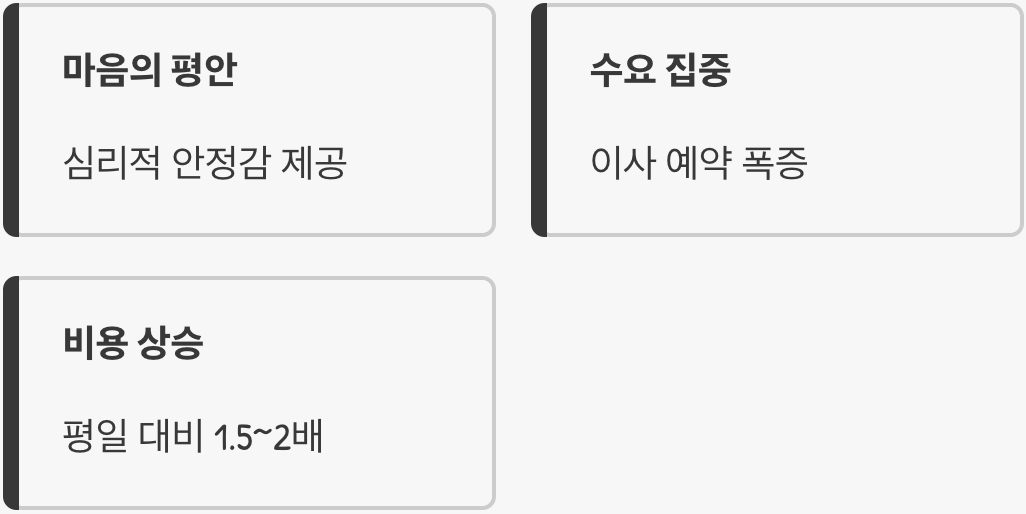 A. 간단한 ‘수요와 공급’의 원리 때문입니다. 이 날에 이사를 하려는 사람들이 한꺼번에 몰리기 때문에, 이삿짐센터나 관련 업체들의 예약이 일찍 마감되고 자연스럽게 가격이 올라가게 됩니다. 보통 평일보다 1.5배에서 2배까지 비싸지기도 합니다.