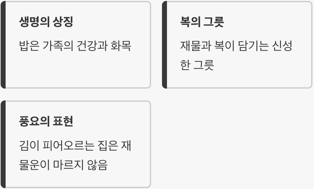그렇다면 수많은 살림살이 중에 왜 유독 ‘밥솥’이 이토록 중요하게 여겨졌을까요? 그 이유는 우리 민족에게 ‘밥’이 가지는 상징성 때문입니다. 예로부터 밥은 단순히 배를 채우는 음식을 넘어, 생명 그 자체이자 가족의 건강과 화목을 의미했습니다.