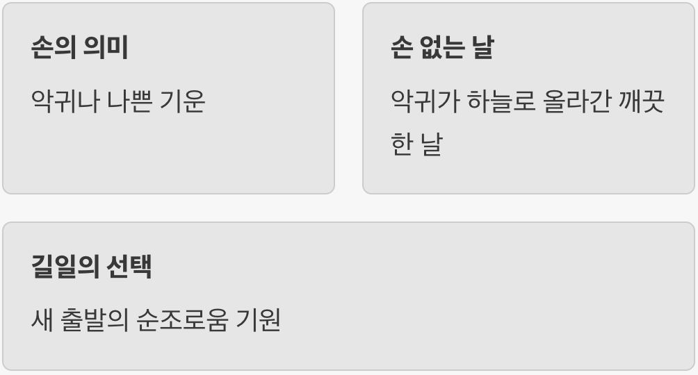 즉, ‘손 없는 날’이란 이 심술궂은 불청객이 하늘로 올라가 자리를 비워, 지상의 어느 곳에도 나쁜 기운이 머물지 않는 가장 깨끗하고 안전한 날을 뜻합니다. 우리 조상들은 이사나 개업처럼 인생의 중요한 새 출발을 할 때, 이 길일(吉日)을 택함으로써 앞으로의 모든 일이 순조롭게 풀리기를 기원했던 것입니다.