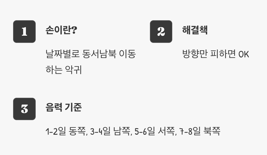 먼저 ‘손 있는 날’ 이사를 피하려는 이유부터 알아야 합니다. 우리 민속 신앙에서 ‘손’은 날짜에 따라 동서남북으로 돌아다니며 사람들의 일을 방해하는 악귀를 뜻합니다. 즉, 이 악귀가 활동하는 방향으로 이사를 가면 안 좋은 일이 생긴다고 믿었던 것이죠.