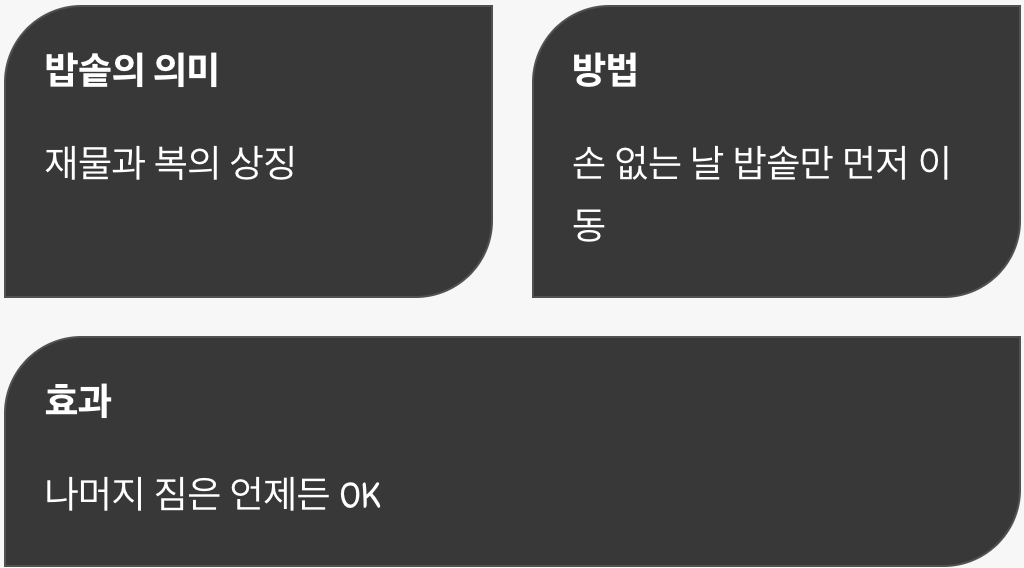 “도저히 방향까지 맞추기는 어려워요.” 라고 생각하는 분들을 위한, 우리 조상들의 재치가 돋보이는 가장 유명한 비방법이 있습니다. 바로 ‘밥솥’을 먼저 새집에 들여놓는 것입니다. 예로부터 밥솥은 한 집안의 재물과 복을 상징하는 가장 중요한 살림살이로 여겨졌습니다.