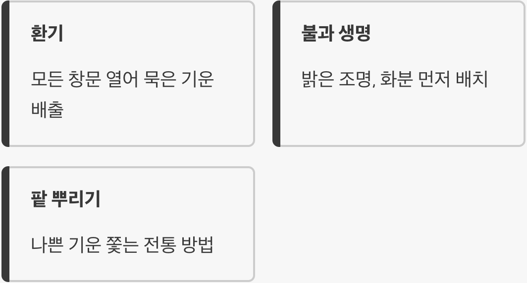 A. 너무 걱정하지 않으셔도 괜찮습니다. 이럴 때를 대비해 앞서 말씀드린 ‘밥솥 먼저 들여놓기’와 같은 비방법이 있는 것입니다. 혹은 이삿짐 차가 집 앞에 도착했을 때, 빗자루로 차 바퀴 주변을 쓸어 나쁜 기운을 털어낸다는 상징적인 행동을 하는 것도 마음의 위안을 줄 수 있습니다.