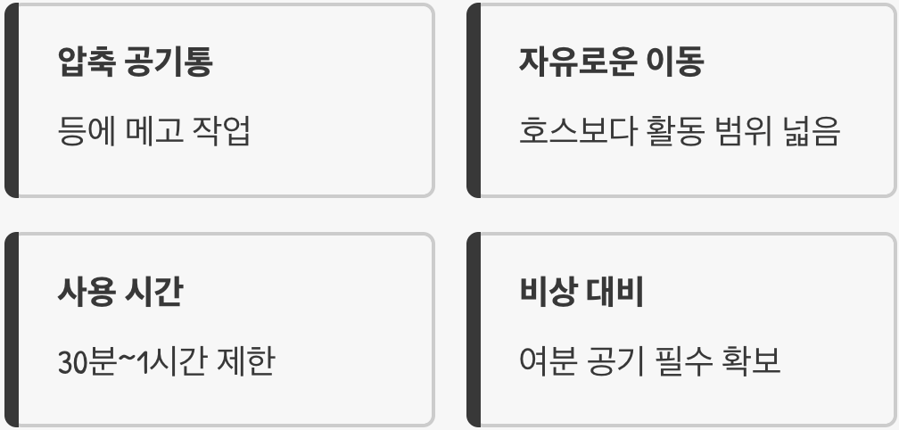 주로 작업 반경이 넓지 않고 오랫동안 일해야 할 때 유리합니다. 하지만 호스 길이가 제한적이고(보통 40m 이내), 호스가 꼬이거나 밟히면 공기 공급이 끊길 수 있다는 단점이 있습니다. 작업 전 호스 상태를 꼼꼼하게 점검하고, 호스가 꺾이지 않도록 잘 정리해 두는 것이 안전을 확보하는 첫걸음입니다.