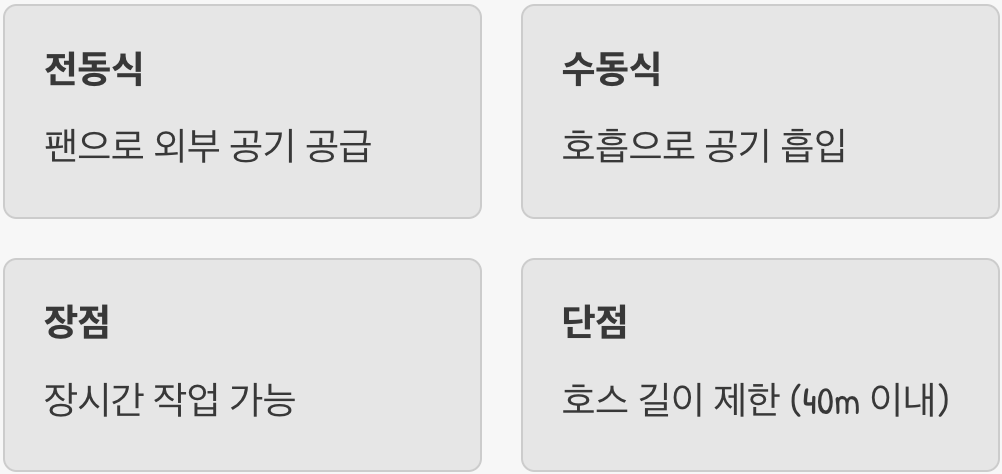 송기마스크는 크게 두 종류로 나뉩니다. 첫 번째는 긴 호스를 통해 바깥의 깨끗한 공기를 작업자에게 전달해 주는 '호스 마스크'입니다. 전동 팬이 달린 기계가 밖에서 공기를 훅훅 불어넣어 주는 방식(전동식)과, 작업자가 숨을 들이쉴 때 공기가 따라 들어오는 방식(수동식)이 있습니다.