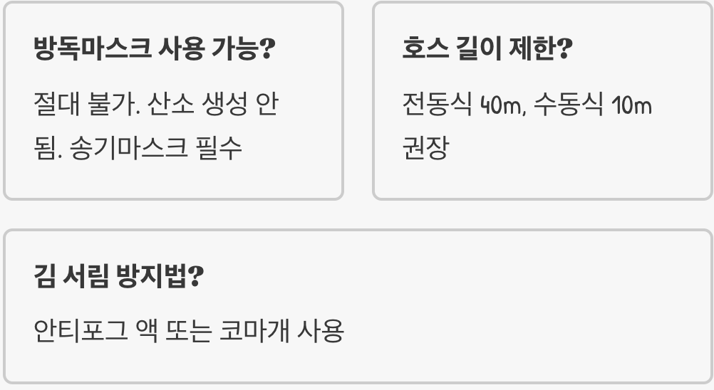 화관법상 산소 18% 미만·가스 2% 이상 장소 필수 비치하며 공급 공기 압력 1.75kg/㎠ 이하로 조절합니다. - 밀폐공간 출입 시에는 반드시 공기호흡기 또는 송기마스크를 착용