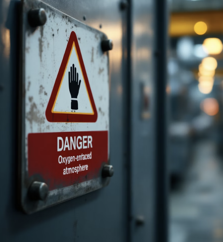 산소가 많으면 무조건 좋을 것 같지만, 그렇지 않습니다. 농도가 23.5%를 넘어가면 '산소 과잉' 상태가 되어 화재나 폭발 위험이 급격하게 증가합니다. 작은 불꽃이나 정전기만으로도 큰 불이 날 수 있는 아주 위험한 환경이 되는 것입니다.