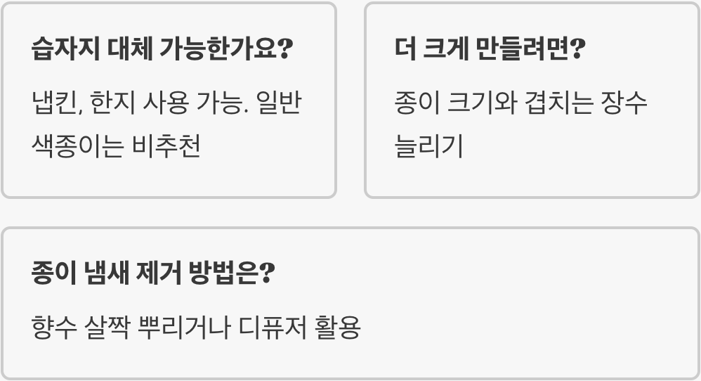 A. 종이 특유의 냄새가 싫다면 완성된 꽃에 평소 부모님이 좋아하시는 향수를 살짝 뿌려보세요. 은은한 향기까지 더해져 진짜 꽃보다 더 매력적인 선물이 됩니다. 또는 디퓨저 스틱에 꽃을 고정해서 향기 나는 인테리어 소품으로 활용하는 것도 좋은 방법입니다.