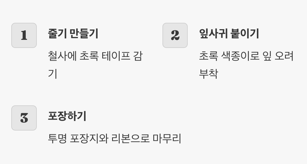 꽃을 고정할 얇은 철사나 빵 끈, 그리고 줄기를 감쌀 초록색 테이프도 함께 준비하면 좋습니다. 만약 철사가 없다면 튼튼한 고무줄이나 실을 사용해도 무방합니다. 재료비는 천 원도 안 들지만, 완성된 작품의 가치는 돈으로 환산할 수 없을 만큼 훌륭하니 걱정 말고 시작해 보세요.