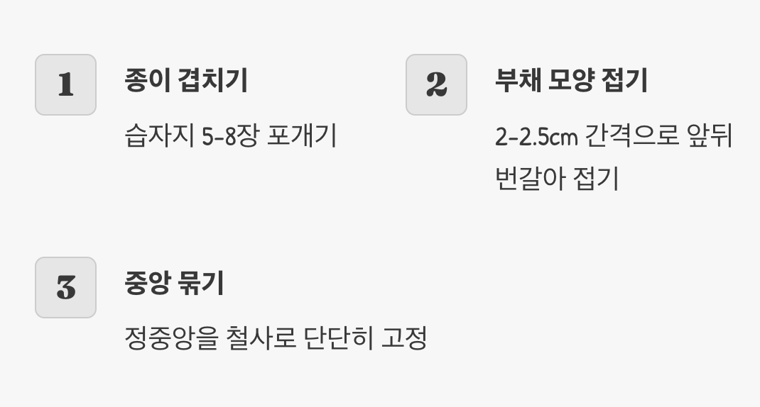 종이를 겹쳐 놓은 상태에서 어릴 적 더울 때 만들던 부채처럼 앞뒤로 번갈아 가며 접어주세요. 이때 접는 간격은 손가락 한 마디 정도인 2cm에서 2.5cm가 적당합니다. 간격이 너무 넓으면 꽃잎이 듬성듬성해 보이고, 너무 좁으면 펴기가 힘들어지니 일정한 간격을 유지하는 것이 중요합니다.
