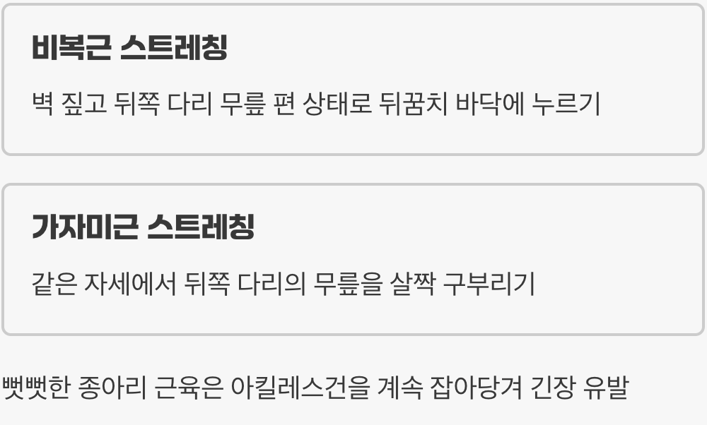 아킬레스건이 짧거나 약한 경우 특히 중요한 종아리 스트레칭 습관화 필요성과 통증 발생 시 대처법을 소개합니다. - 재발위험 큰 '아킬레스건염'…예방운동 필수! - 헬스경향