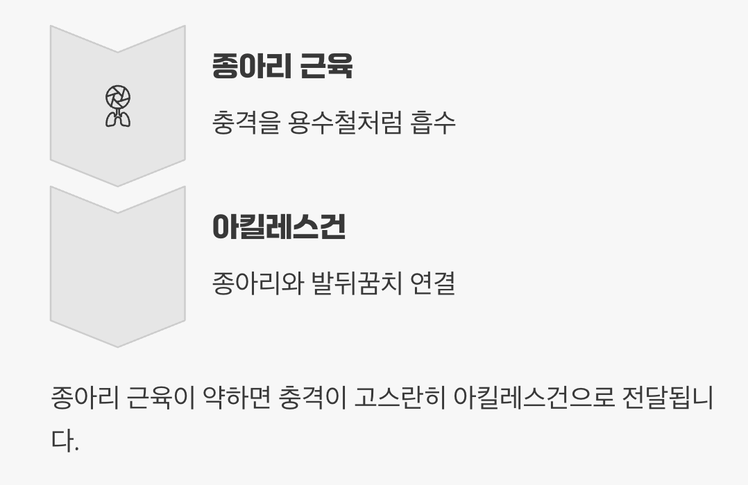 우리 몸에서 가장 두껍고 강한 힘줄인 아킬레스건은 종아리 근육과 발뒤꿈치 뼈를 연결하는 중요한 다리 역할을 합니다. 우리가 걷거나 뛸 때 발생하는 엄청난 충격을 종아리 근육이 먼저 용수철처럼 흡수해주는데, 이 근육이 약하면 그 충격이 고스란히 아킬레스건으로 전달됩니다.
